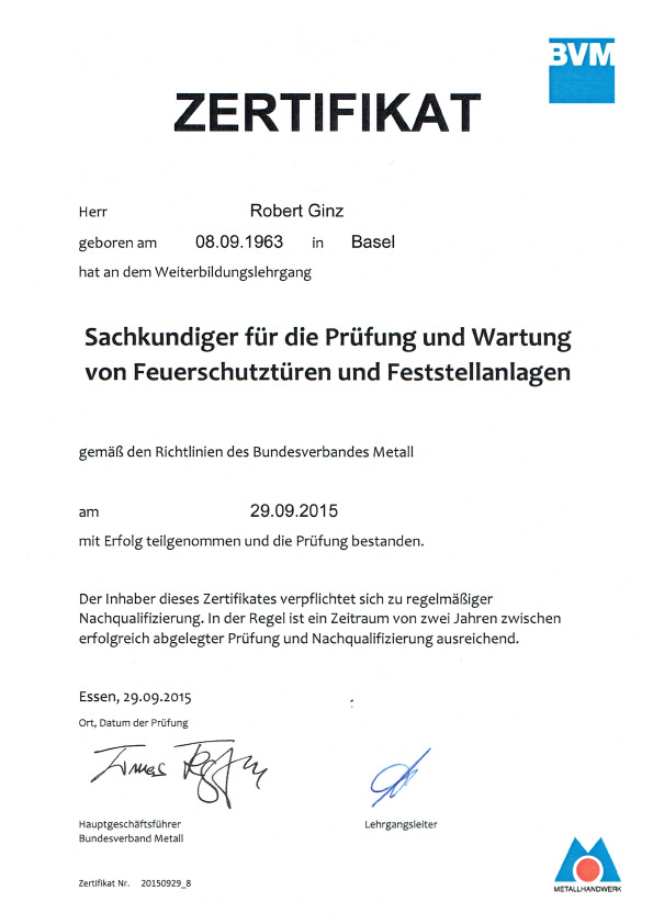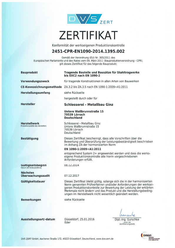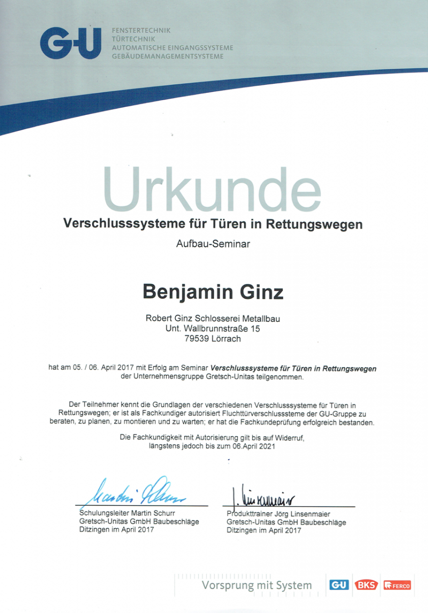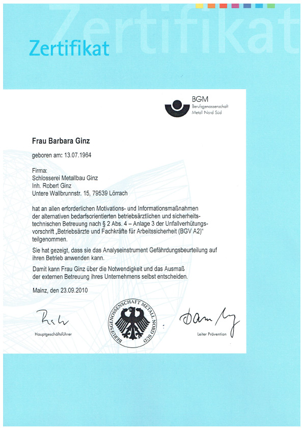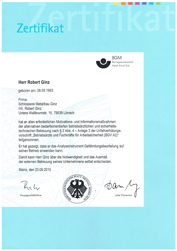 SCHLOSSEREI GINZ | Zertifikate