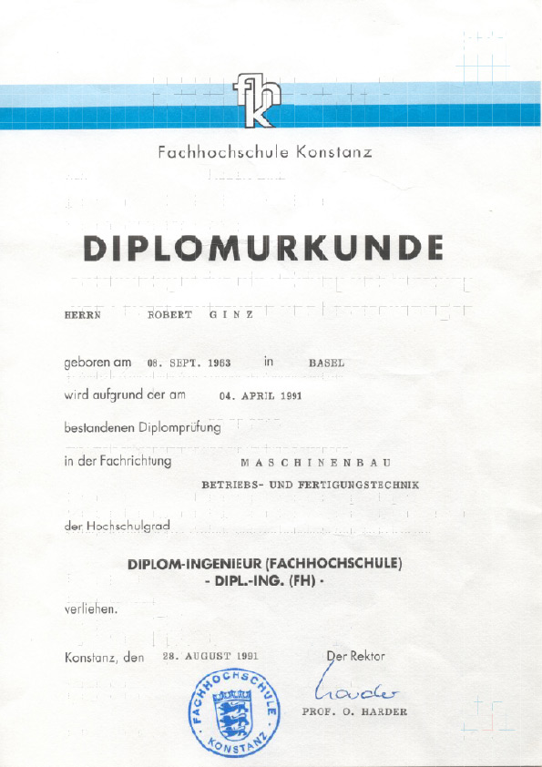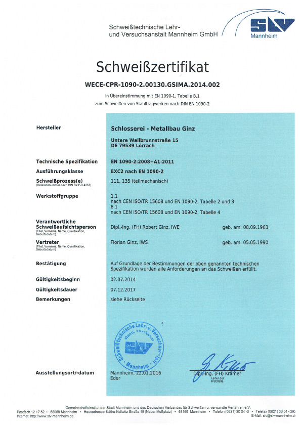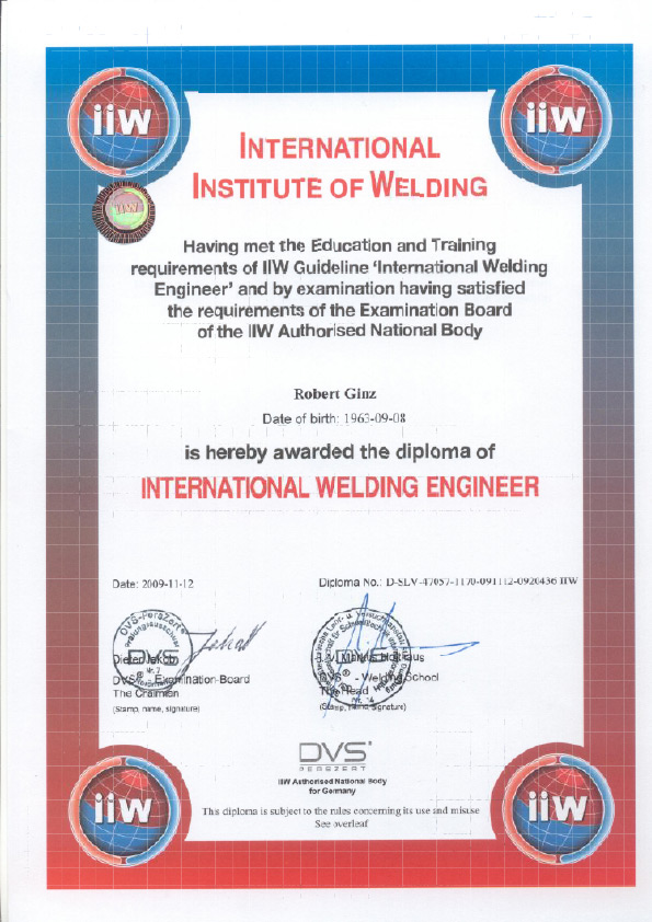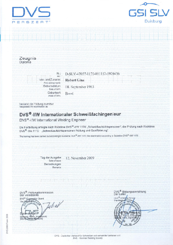 Verantwortliche Schweißaufsichtsperson: Robert Ginz, Internationaler Schweißfachingenieur SFI/IWE.